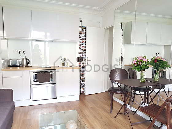 Este apartamento posee una magnífica cocina con parquet en el sueloy todo el equipamiento esencial para su vida diaria : placas eléctricas, refrigerador, congelador, horno, campana extractora, tostador, hervidor, cafetera, mesa, estantería, armario empotrado, vajilla, 1 silla(s), bin.