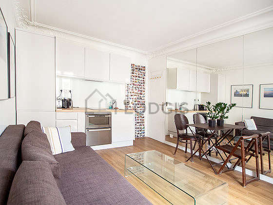SalónEste apartamento está formado por un salón con parquet en el suelo y ventanas doble acristalamiento y una vista a la calle. Este salón muy tanquilo está amueblado y equipado para que su estancia sea agradable : sofá, mesa, mesita, armario empotrado, 2 silla(s), taburete, mirror, coat stand, painting.