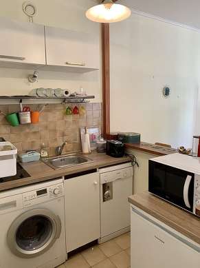 Este apartamento posee una bonito cocina con parquet en el sueloy todo el equipamiento esencial para su vida diaria : placas eléctricas, refrigerador, congelador, horno micro-ondas, tostador, hervidor, cafetera, armario empotrado, vajilla, bar.