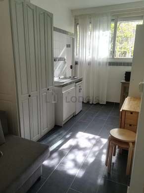 Este apartamento posee una bonito cocina con azulejo en el sueloy todo el equipamiento necesario para su vida diaria : placas eléctricas, refrigerador, horno micro-ondas, mesa, armario, armario empotrado, vajilla.