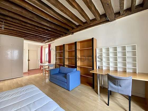 SalónEste apartamento está formado por un salón con parquet en el suelo y ventanas y una vista a al patio. Este salón muy tanquilo está amueblado y equipado para que su estancia sea agradable : edredones, sofá, mesa, mesa de estudio, estantería, armario, cómoda, 2 silla(s)1 cama.