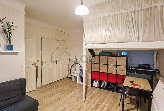 SalónEste apartamento está formado por un salón con parquet en el suelo y ventanas y una vista a al patio. Este salón está amueblado y equipado para que su estancia sea agradable : sábanas, edredones, sofá, mesa de estudio, ropero, estantería, cómoda, armario empotrado, 1 silla(s)1 cama en altura.