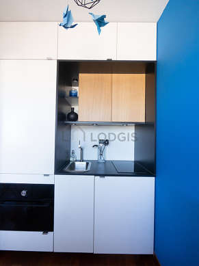 Este apartamento posee una magnífica cocina con parquet en el sueloy todo el equipamiento indispensable para su vida diaria : placas eléctricas, refrigerador, congelador, horno, micro ondas, horno micro-ondas, hervidor, mesa, estantería, armario, aparador, armario empotrado, vajilla, 1 silla(s), bin, vase.