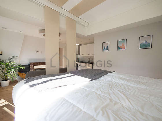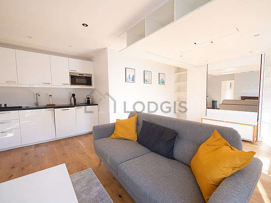 SalónEste apartamento está formado por un salón con parquet en el suelo y ventanas doble acristalamiento. Este salón muy tanquilo está amueblado y equipado para que su estancia sea agradable : televisor, sofá, mesa, vajilla, chimenea, 1 silla(s), floor lamp, painting, carpet1 cama.