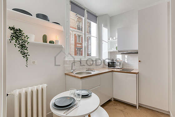 Este apartamento posee una magnífica cocina con parquet en el sueloy todo el equipamiento indispensable para su vida diaria : placas eléctricas, refrigerador, micro ondas, hervidor, mesa, armario empotrado, vajilla, 1 silla(s).