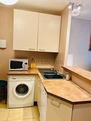 Este apartamento posee una magnífica cocina con azulejo en el sueloy todo el equipamiento indispensable para su vida diaria : placas eléctricas, refrigerador, congelador, horno, micro ondas, campana extractora, armario, armario empotrado, vajilla, bar.