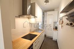 Este apartamento posee una magnífica cocina con azulejo en el sueloy todo el equipamiento esencial para su vida diaria : placas eléctricas, refrigerador, congelador, horno, congelador, campana extractora, cafetera, estantería, armario empotrado, vajilla, cutlery, wooden spoon, lamp, bin, light.