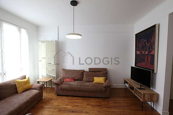 SalónEste apartamento está formado por un salón con parquet en el suelo y ventanas. Este salón muy tanquilo está amueblado y equipado para que su estancia sea agradable : televisor, sofá, 1 sillones, mesita, estantería.