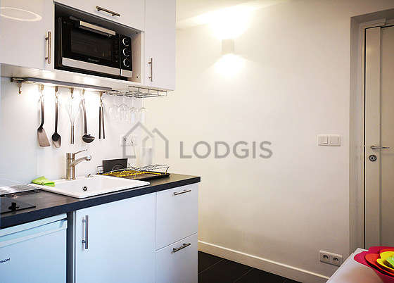 Este apartamento posee una magnífica cocina con azulejo en el sueloy todo el equipamiento necesario para su vida diaria : placas eléctricas, refrigerador, horno, congelador, mesa, estantería, armario empotrado, vajilla, 1 silla(s).