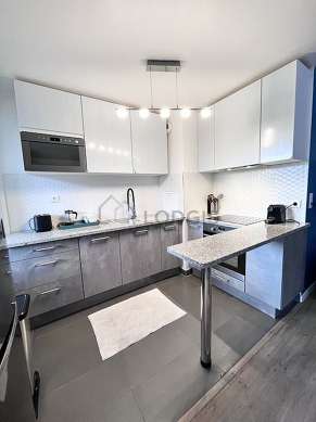 Este apartamento posee una magnífica cocina con azulejo en el sueloy todo el equipamiento necesario para su vida diaria : placas eléctricas, refrigerador, congelador, horno, micro ondas, horno micro-ondas, congelador, campana extractora, tostador, cafetera, vajilla, electrodomésticos, mixer, bin.