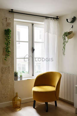 SalónEste apartamento está formado por un salón ventanas doble acristalamiento. Este salón está amueblado y equipado para que su estancia sea agradable : televisor, sábanas, edredones, refrigerador, sofá, 1 sillones, mesa de estudio, ropero, estantería, armario, vajilla, 1 silla(s), mesita de noche, airer, floor lamp, tv stand, mirror, coat stand, bin, painting, carpet1 sofá cama.