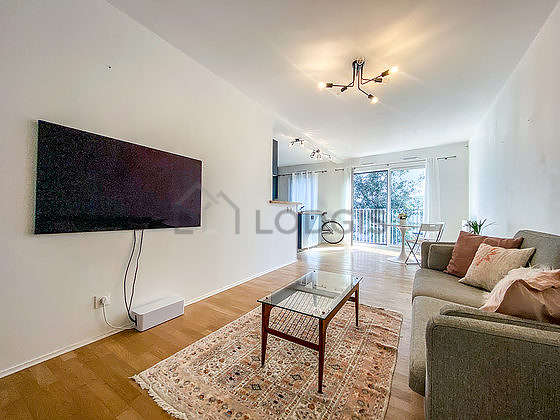 Este apartamento está formado por un salón ventanas doble acristalamiento. Este salón está amueblado y equipado para que su estancia sea agradable : televisor, sofá, mesa, mesita, armario empotrado, 1 silla(s).