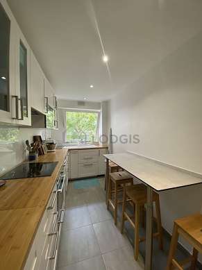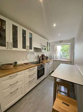 Este apartamento posee una magnífica cocina con azulejo en el sueloy todo el equipamiento esencial para su vida diaria : placas eléctricas, refrigerador, horno, micro ondas, campana extractora, tostador, mesa, vajilla, taburete, bin.