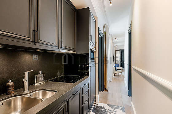 Este apartamento posee una cocinay todo el equipamiento indispensable para su vida diaria : ropa de cama, placas eléctricas, refrigerador, congelador, horno, campana extractora, tostador, hervidor, cafetera.