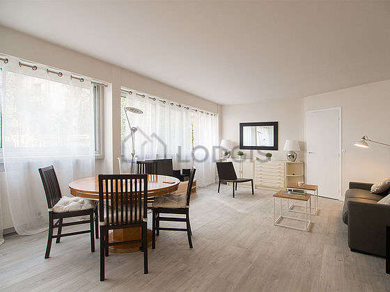 SalónEste apartamento está formado por un salón con parquet en el suelo y ventanas doble acristalamiento y una vista a jardín. Este salón muy tanquilo está amueblado y equipado para que su estancia sea agradable : televisor, sofá, mesa, mesita, mesa de estudio, ropero, estantería, aparador, armario empotrado, 4 silla(s)1 sofá cama.
