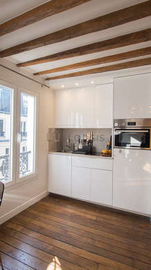 Este apartamento posee una cocinay todo el equipamiento indispensable para su vida diaria : placas eléctricas, refrigerador, congelador, horno, horno micro-ondas, tostador, cafetera, vajilla.