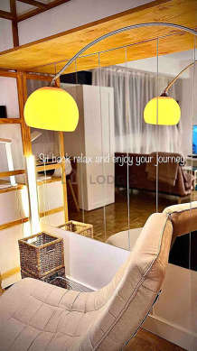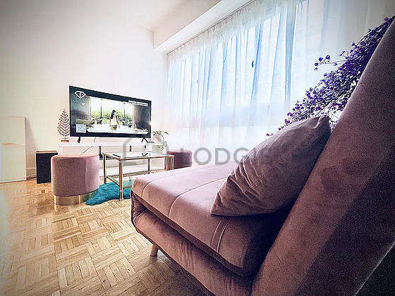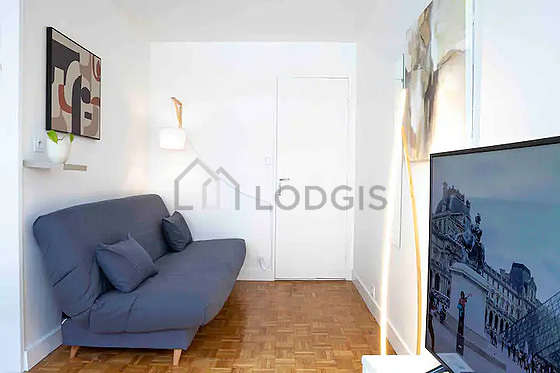 SalónEste apartamento está formado por un salón con parquet en el suelo y ventanas. Este salón tranquilo está amueblado y equipado para que su estancia sea agradable : televisor, sábanas, mesa de estudio, estantería, armario empotrado, 1 silla(s), tv stand1 cama, 1 sofá cama.