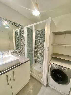 Este apartamento tiene una sala de baño magnífica y muy clara. Este baño tiene todo lo necesario para su bienestar diario : toallas, estantería, armario empotrado, ducha, airer, lamp, sink, mirror. El WC está separado de la sala del baño y ubicado en un espacio independiente.