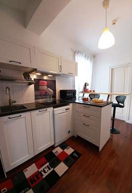 Este apartamento posee una magnífica cocina con parquet en el sueloy todo el equipamiento esencial para su vida diaria : placas eléctricas, refrigerador, congelador, campana extractora, cafetera, armario empotrado, vajilla, taburete, bar, work surface.