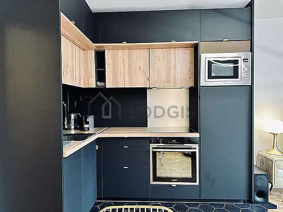 Este apartamento posee una cocinay todo el equipamiento esencial para su vida diaria : placas eléctricas, refrigerador, congelador, horno micro-ondas, hervidor, cafetera, vajilla.