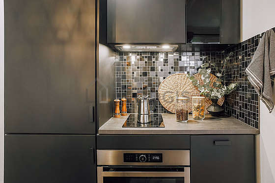 Este apartamento posee una cocinay todo el equipamiento necesario para su vida diaria : placas eléctricas, refrigerador, horno, micro ondas, congelador, tostador, mesa, armario, vajilla, 1 silla(s).