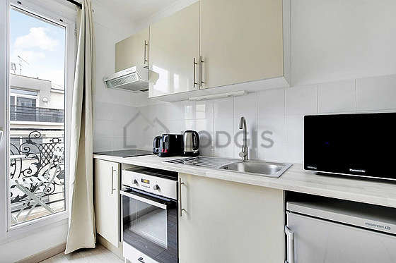 Este apartamento posee una cocinay todo el equipamiento necesario para su vida diaria : placas eléctricas, refrigerador, horno, tostador, hervidor, cafetera.