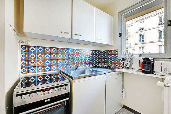 Este apartamento posee una cocinay todo el equipamiento necesario para su vida diaria : placas eléctricas, refrigerador, horno, micro ondas, tostador, hervidor, cafetera.