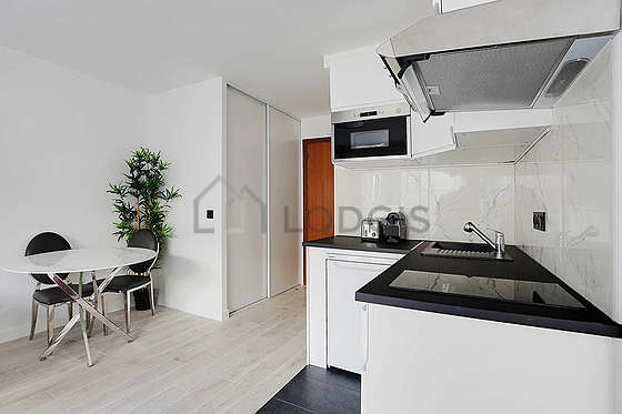 Este apartamento posee una cocinay todo el equipamiento esencial para su vida diaria : placas eléctricas, refrigerador, micro ondas, campana extractora, hervidor, cafetera.