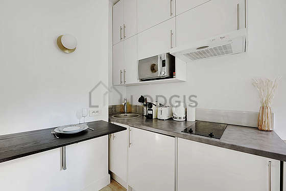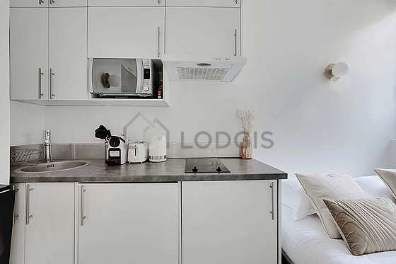 Este apartamento posee una cocinay todo el equipamiento indispensable para su vida diaria : placas eléctricas, refrigerador, congelador, horno, micro ondas, campana extractora, tostador, hervidor, cafetera, vajilla.
