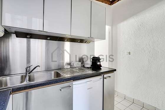 Este apartamento posee una cocinay todo el equipamiento necesario para su vida diaria : placas eléctricas, refrigerador, congelador, micro ondas, tostador, hervidor, cafetera.