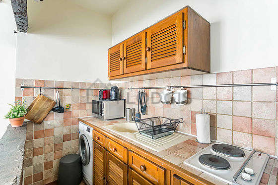 Este apartamento posee una cocinay todo el equipamiento necesario para su vida diaria : placas eléctricas, refrigerador, congelador, horno, micro ondas, tostador, hervidor, cafetera, armario empotrado, vajilla.