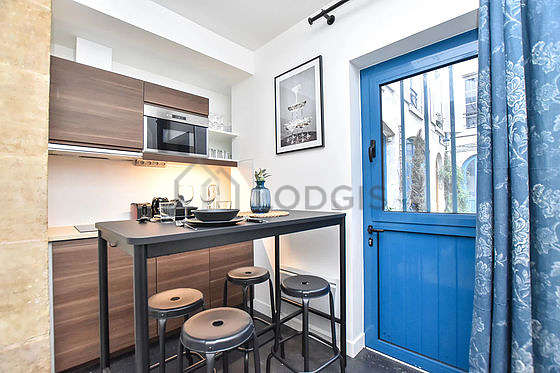 Este apartamento posee una cocinay todo el equipamiento indispensable para su vida diaria : placas eléctricas, refrigerador, congelador, horno, micro ondas, horno micro-ondas, tostador, hervidor, cafetera, vajilla.