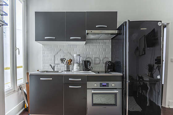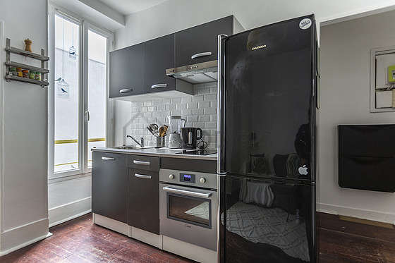 Este apartamento posee una magnífica cocina con azulejo en el sueloy todo el equipamiento esencial para su vida diaria : placas eléctricas, refrigerador, congelador, horno, micro ondas, campana extractora, hervidor, cafetera, armario empotrado, vajilla, electrodomésticos.