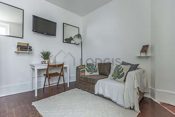 SalónEste apartamento está formado por un salón con parquet en el suelo y ventanas doble acristalamiento. Este salón muy tanquilo está amueblado y equipado para que su estancia sea agradable : televisor, edredones, sofá, mesa de estudio, estantería, armario empotrado, 1 silla(s), floor lamp, lamp, mirror, carpet.