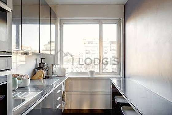 Este apartamento posee una magnífica cocina con azulejo en el sueloy todo el equipamiento necesario para su vida diaria : placas eléctricas, refrigerador, congelador, horno, horno micro-ondas, tostador, hervidor, cafetera, estantería, vajilla, taburete, mixer, bin, set of tables.