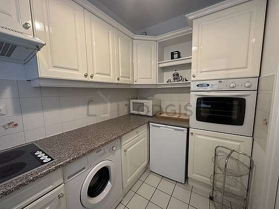 Este apartamento posee una cocinay todo el equipamiento esencial para su vida diaria : placas eléctricas, refrigerador, congelador, horno, micro ondas, campana extractora, hervidor, cafetera, armario empotrado, vajilla.