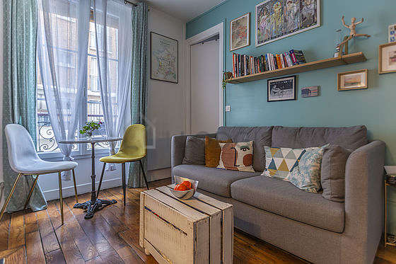 SalónEste apartamento está formado por un salón con parquet en el suelo y ventanas doble acristalamiento. Este salón muy tanquilo está amueblado y equipado para que su estancia sea agradable : sofá, mesa, mesita, estantería, 1 silla(s).