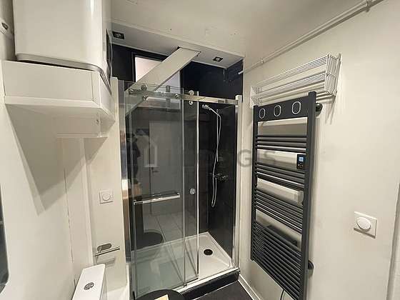 Este apartamento tiene una sala de baño. Este baño tiene todo lo necesario para su bienestar diario : toallas, armario, ducha, secador de pelo, airer, sink, towel rack, radiador seca-toallas. El WC está integrado en la sala del baño.