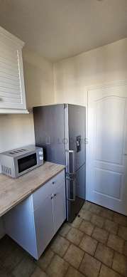 Este apartamento posee una magnífica cocina con azulejo en el sueloy todo el equipamiento esencial para su vida diaria : placas eléctricas, refrigerador, horno, micro ondas, campana extractora, armario, armario empotrado, vajilla.