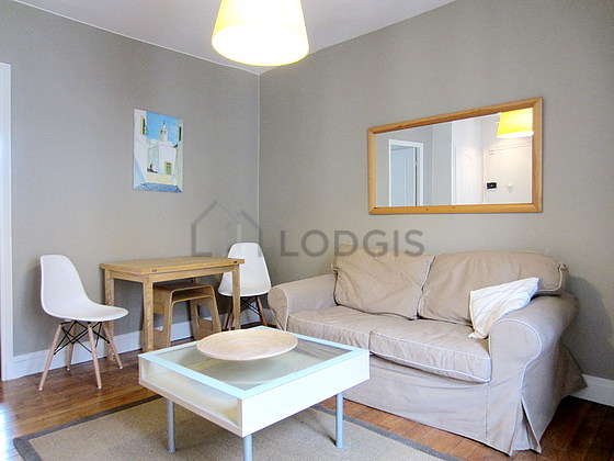Este apartamento está formado por un salón con parquet en el suelo y ventanas doble acristalamiento y una vista a la calle. Este salón tranquilo está amueblado y equipado para que su estancia sea agradable : televisor, sofá, mesa, mesita, ropero, armario empotrado, 2 silla(s), taburete.