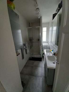 Este apartamento tiene una sala de baño. Este baño tiene todo lo necesario para su bienestar diario : toallas, estantería, armario empotrado, ducha, sink. El WC está separado de la sala del baño y ubicado en un espacio independiente.
