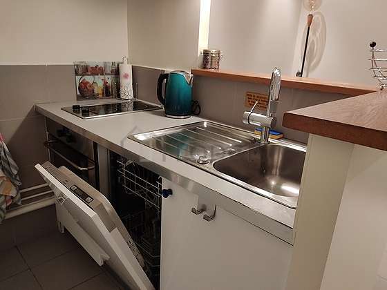 Este apartamento posee una cocinay todo el equipamiento indispensable para su vida diaria : placas eléctricas, refrigerador, congelador, horno, campana extractora, tostador, hervidor, cafetera, armario empotrado, vajilla, 1 silla(s), bar, bin.