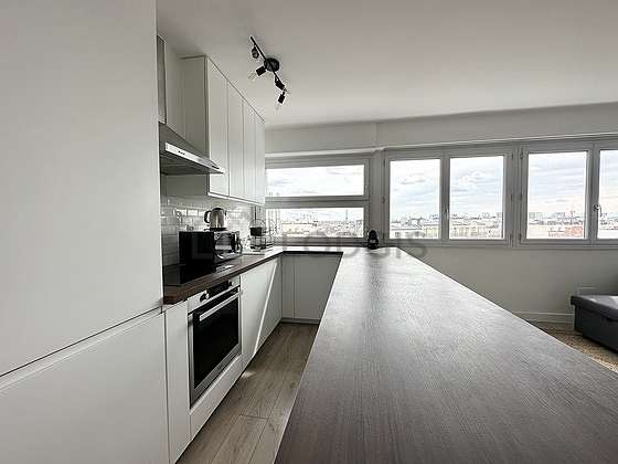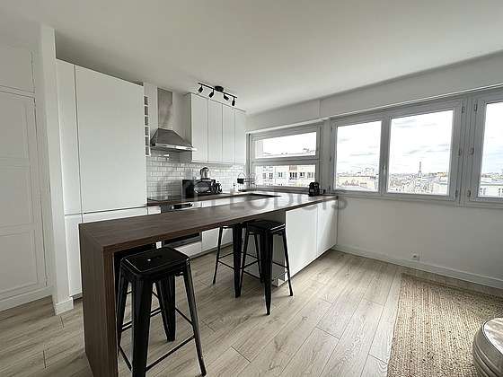 Este apartamento posee una magnífica cocina con parquet en el sueloy todo el equipamiento indispensable para su vida diaria : placas eléctricas, refrigerador, congelador, horno, micro ondas, campana extractora, tostador, hervidor, cafetera, armario empotrado, vajilla, 1 silla(s), bar.