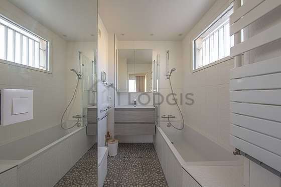 Este apartamento tiene una sala de baño. Este baño tiene todo lo necesario para su bienestar diario : ducha, sink, radiador seca-toallas. El WC está separado de la sala del baño y ubicado en un espacio independiente.