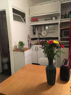 Este apartamento posee una cocinay todo el equipamiento indispensable para su vida diaria : placas eléctricas, refrigerador, micro ondas, congelador, campana extractora, tostador, hervidor, mesa, armario empotrado, vajilla.