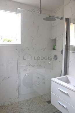 Este apartamento tiene una sala de baño. Este baño tiene todo lo necesario para su bienestar diario : ducha, sink, radiador seca-toallas. El WC está separado de la sala del baño y ubicado en un espacio independiente.