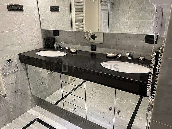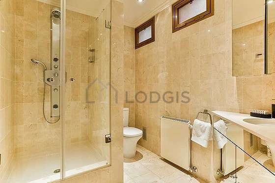 Este apartamento tiene una sala de baño. Este baño tiene todo lo necesario para su bienestar diario : toallas, armario, bañera, ducha, bañera de hydromasaje, secador de pelo, ducha hydromasage, sink, mirror, towel rack, bin, radiador seca-toallas. El WC está integrado en la sala del baño.
