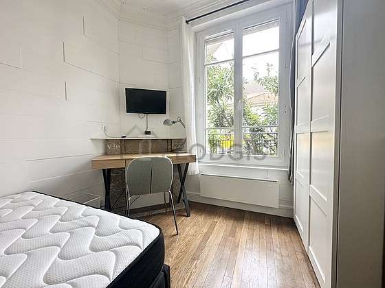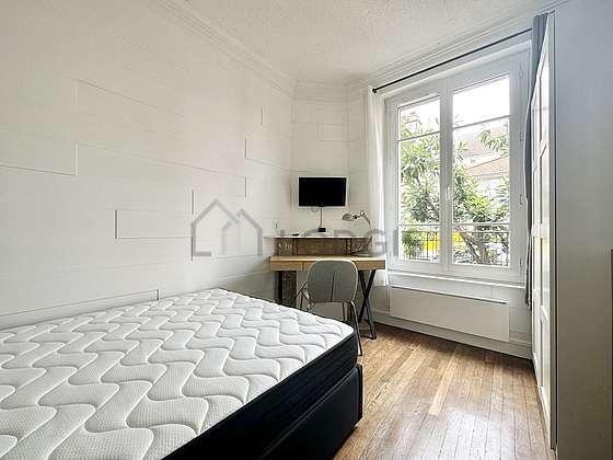 SalónEste apartamento está formado por un salón con parquet en el suelo y ventanas y una vista a la calle. Este salón tranquilo está amueblado y equipado para que su estancia sea agradable : televisor, sábanas, edredones, mesa de estudio, cómoda, armario empotrado, 1 silla(s)1 cama.