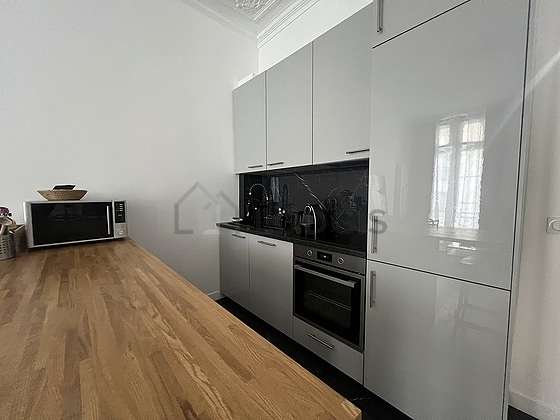 Este apartamento posee una cocinay todo el equipamiento esencial para su vida diaria : placas eléctricas, refrigerador, congelador, horno, micro ondas, campana extractora, tostador, armario empotrado, vajilla, taburete, bar.