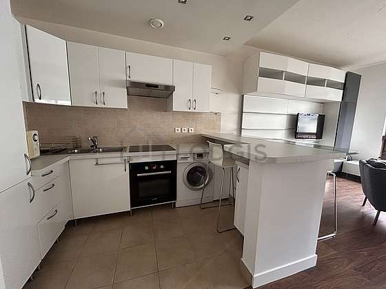 Este apartamento posee una magnífica cocina con azulejo en el sueloy todo el equipamiento indispensable para su vida diaria : placas eléctricas, refrigerador, congelador, horno, micro ondas, campana extractora, armario empotrado, vajilla, taburete.